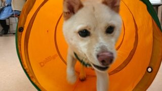 今回はアジリティの種目の1つ 「トンネル」に挑戦しました! トンネルは上も下も輪っかで囲われて暗く 足場もくしゃくしゃで不安定の為 怖がってしまうわんちゃんは少なくありません::>_<:: 福丸ちゃんも最初は警戒して 離れたところから観察し...