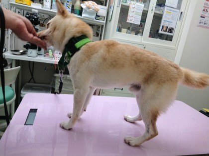 福丸ちゃんを抱きかかえて診察台の上に乗せます。