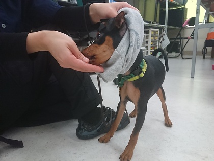 首の輪っかからご褒美を持った手を出すと夢中に!