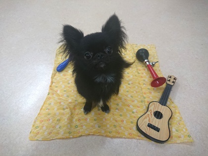 マジックちゃんは音の小さなギターのおもちゃを使って慣らしていきました!