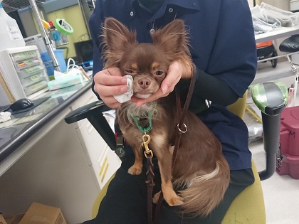 チョコちゃんも目ヤニを拭いてご褒美をあげることを